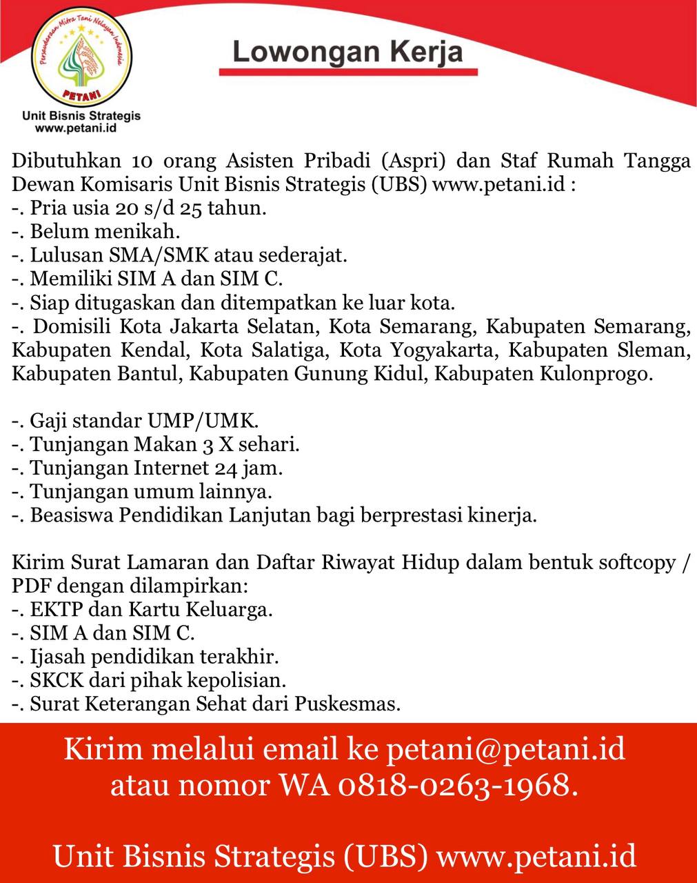 Dibutuhkan 10 orang Asisten Pribadi (Aspri) dan Staf Rumah Tangga Dewan Komisaris Unit Bisnis Strategis (UBS) www.petani.id :